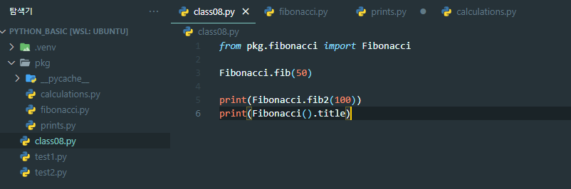 pkg 패키지 디렉토리안에 fibonacci 라는 모듈명으로부터 Fibonacci클래스를 import하는 모습입니다.