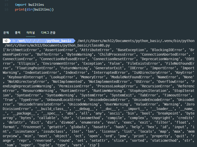파이썬 빌트인 함수 확인해보기 (import없어도 자동으로 사용 가능)